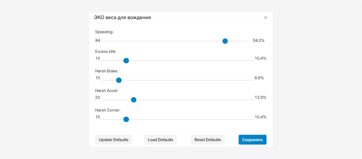 От выбранных весов напрямую зависят штрафные баллы и итоговая оценка водителей и автомобилей.