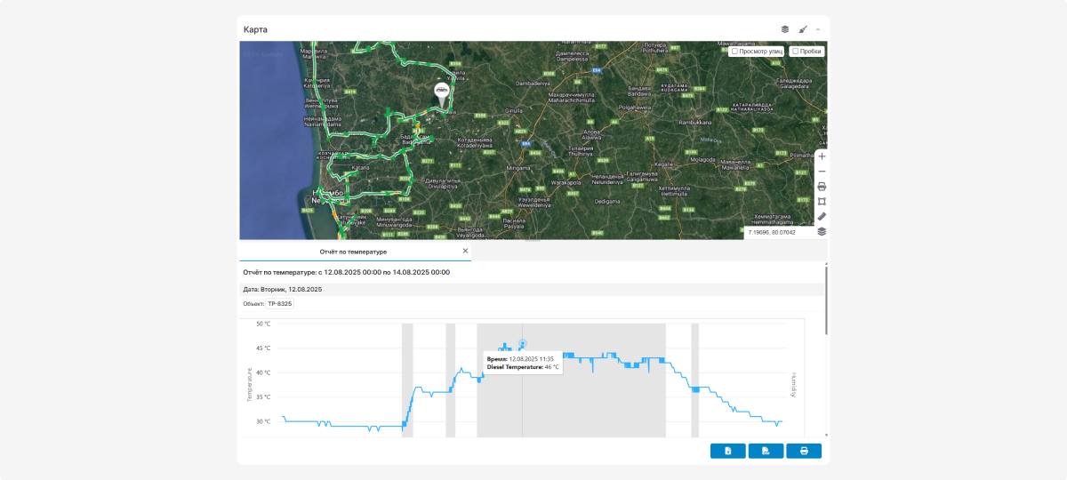 При нажатии на график температуры вы сразу увидите, где в этот момент находился транспорт на карте. Так вы можете отследить связь между изменениями температуры и маршрутом.