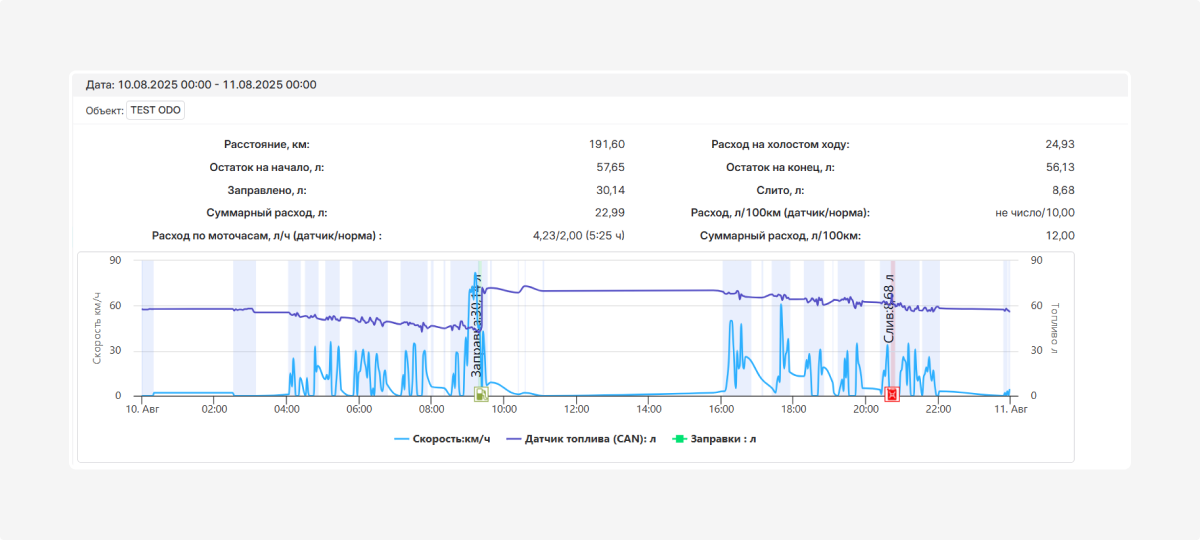 Этот отчёт показывает, как менялись скорость и уровень топлива за выбранный период.  С его помощью вы можете контролировать расход топлива и отслеживать заправки и сливы.