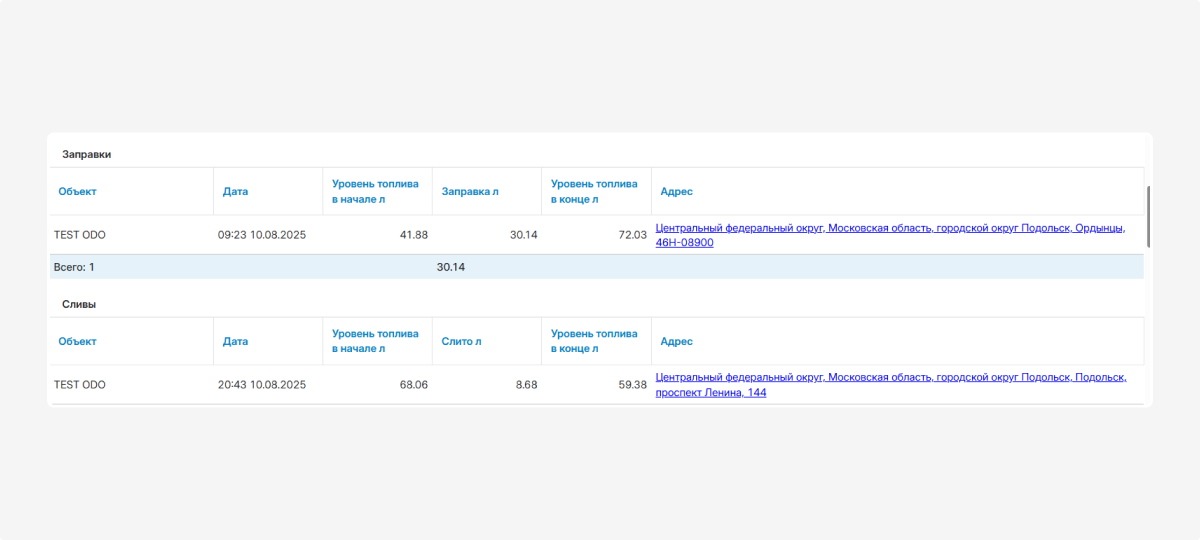 Ниже графика есть таблицы заправок и сливов, которые помогают увидеть, когда и где происходили заправки и сливы, а также проконтролировать объёмы топлива и адреса событий.