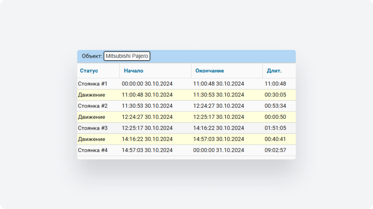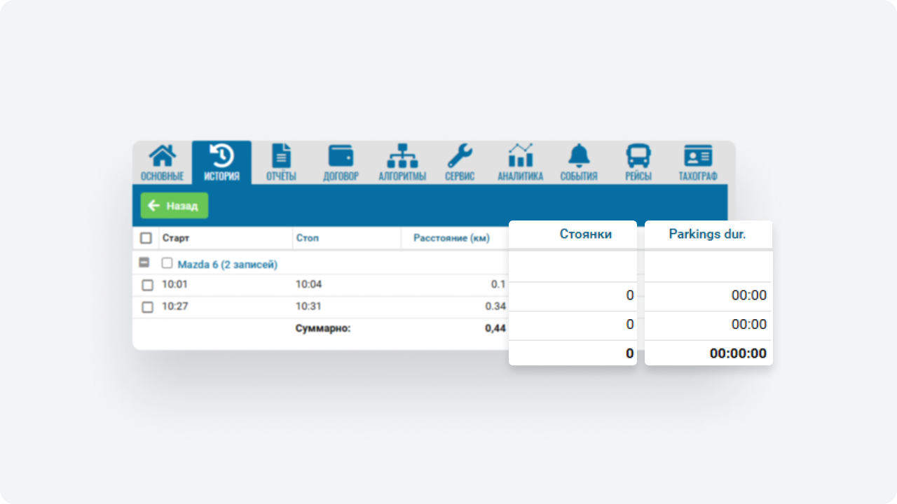 В историю перемещений автомобилей добавили информацию о количестве и продолжительности парковок. Теперь вы увидите, сколько времени каждый автомобиль провёл на стоянке.
