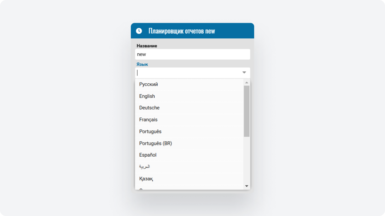 Появилась возможность выбора языка для формирования отчётов в настройках планировщика. Вы можете выбрать желаемый язык из выпадающего списка, который будет применяться к отчётам независимо от языка интерфейса системы.