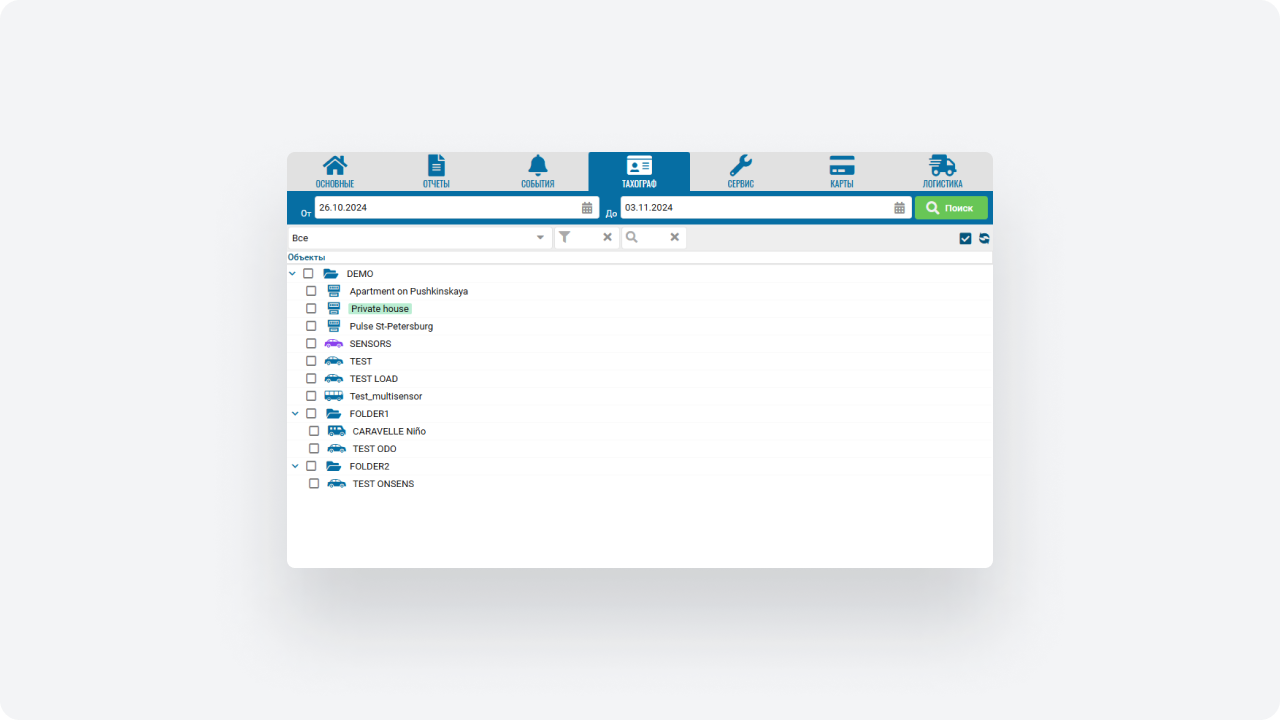 Добавили «Тахограф» в обновлённый интерфейс. Теперь легко управлять настройками модуля и просматривать отчёты.