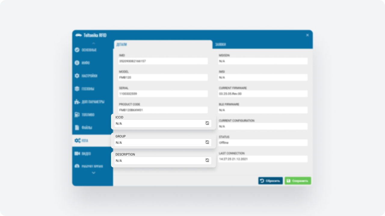 В интерфейсе FOTA для машин с устройствами Teltonika добавили новые поля — ICCID, идентификатор группы и описание, которые помогают идентифицировать SIM-карты, учётные записи и транспортные средства. Кнопка синхронизации позволяет обновлять данные между FOTA и Pilot и автоматически заполнять карточку автомобиля.