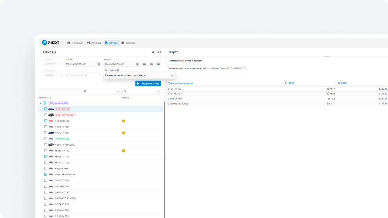 Создали помесячный отчёт о пробеге, который предоставляет информацию о пробеге за каждый месяц, а также общий пробег транспорта за весь выбранный период.