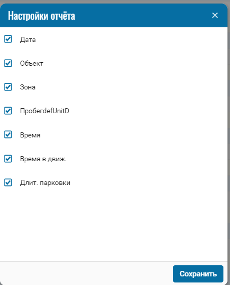 Отчет отображает данные о пробеге в зоне с указанием даты, периода, расстояние и длительности парковки.