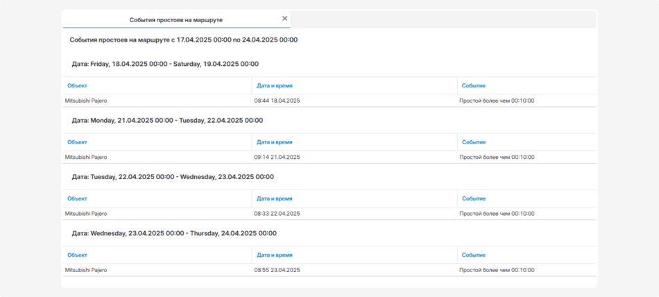 В отчёте «События простоев на маршруте» по умолчанию отображаются все параметры.