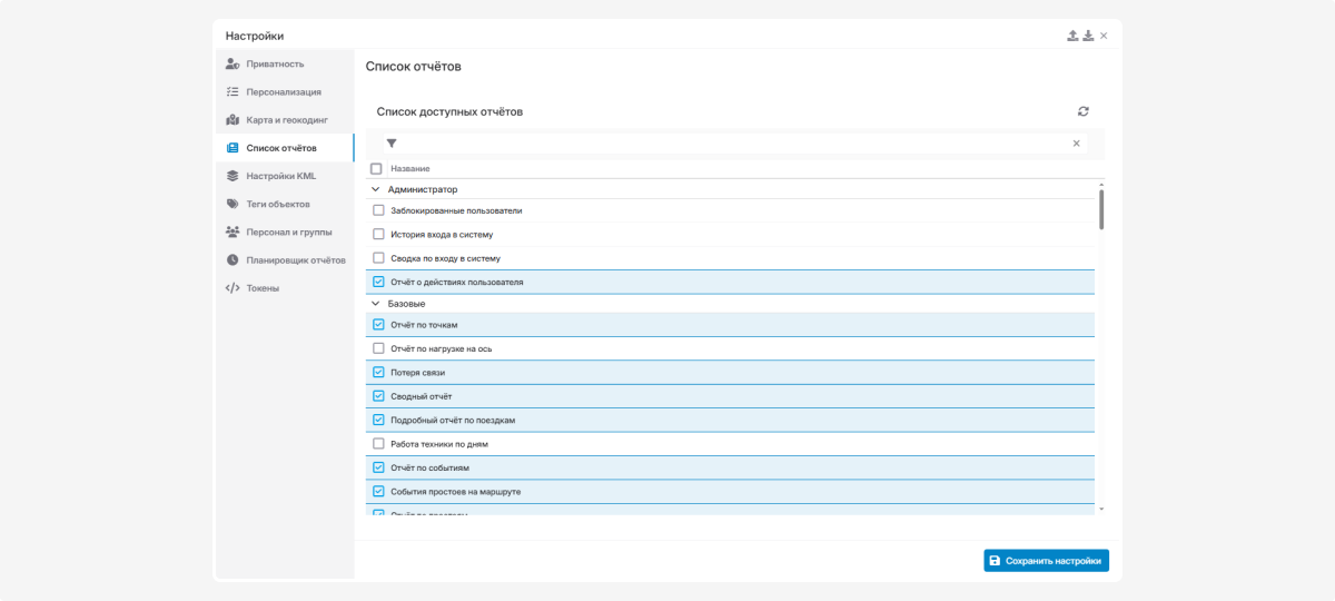 Во вкладке «Список отчётов» вы выбираете, какие типы отчётов вы хотите использовать. Выбранные здесь типы будут доступны при создании нового отчёта.