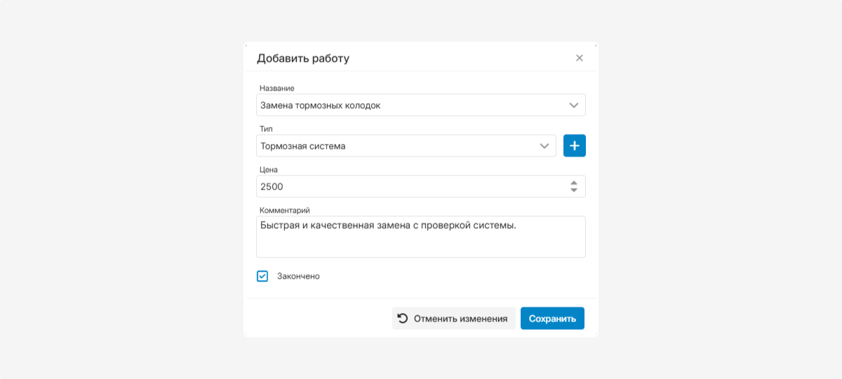 Название работы — например, «Замена тормозных колодок»