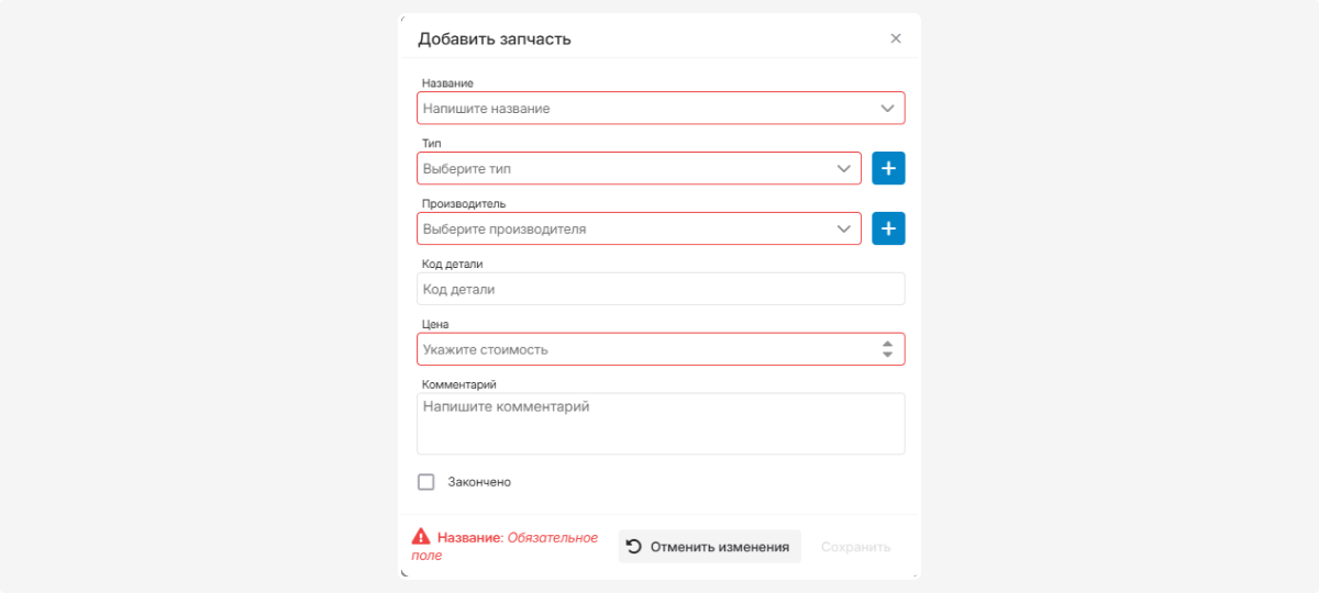 Комментарий — при необходимости4. Поставьте галочку «Закончено», если запчасть уже установлена