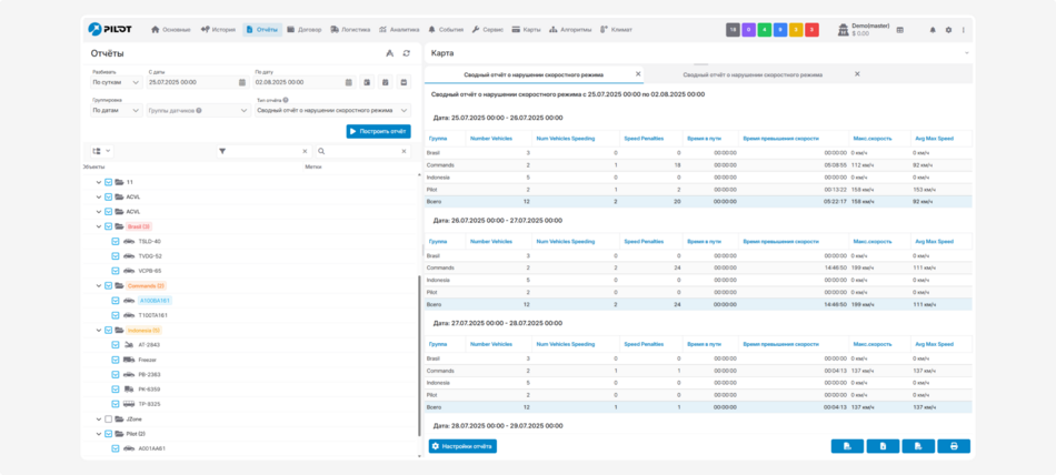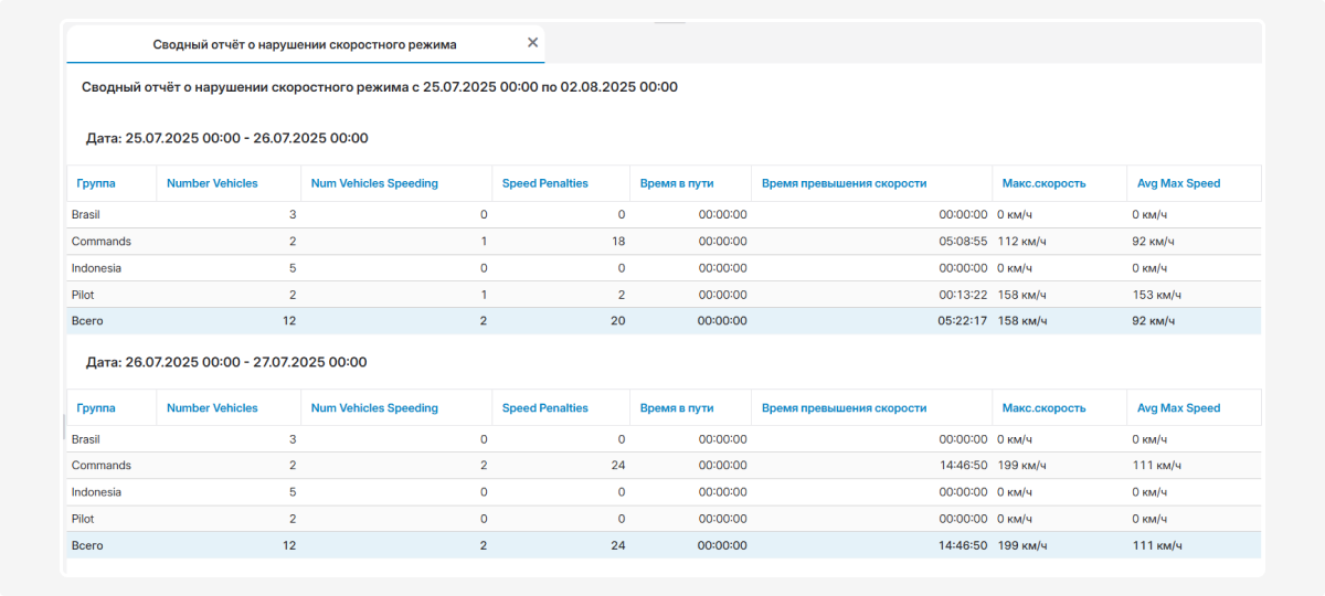 Сводный отчёт о нарушении скоростного режима показывает, какие транспортные средства и когда превышали установленную вами скорость за выбранный период. Такой отчёт помогает контролировать соблюдение скоростного режима.